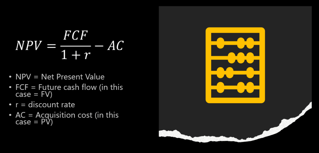 Now we will calculate the Net Present Value (NPV) of option 2 by subtracting the Present Value (which is here the acquisition cost) from the discounted Future Value. We get the following formula: